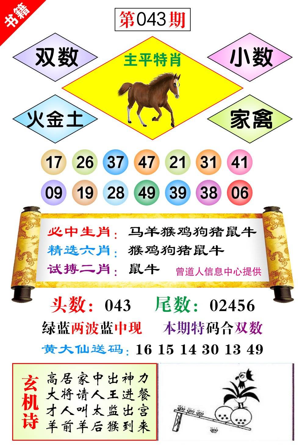 | 043期:必中五肖: 牛鼠蛇狗兔 |